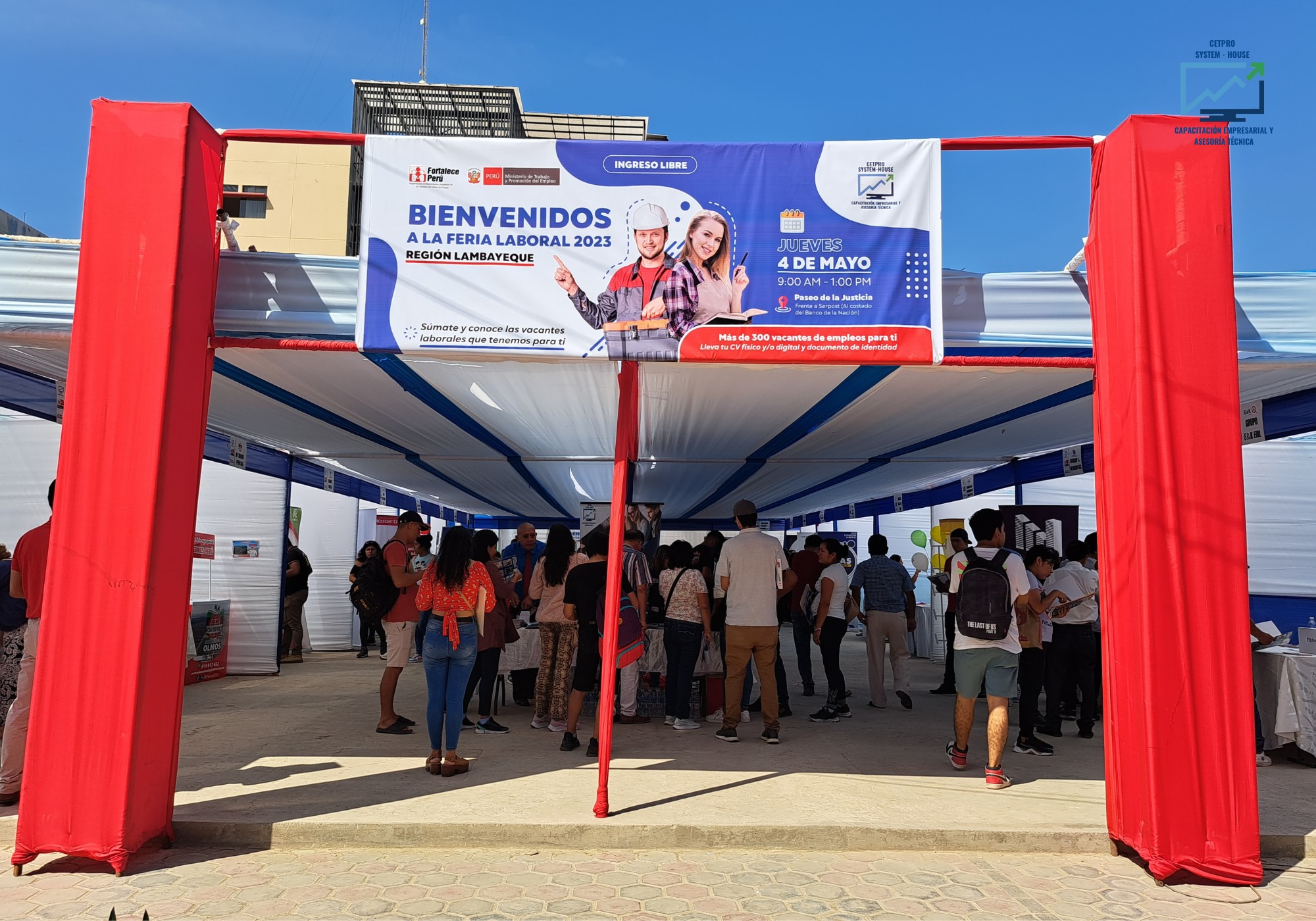Feria realizada el 04 mayo en el Paseo De La Justicia, dentro de las actividades programadas para la inserción laboral de los jóvenes capacitados en convenio con el Programa Fortalece Perú, se ha organizado una FERIA LABORAL en la región de Lambayeque; dicha actividad tiene como finalidad conocer el potencial operativo, productivo y laboral de las empresas que contribuyen con la economía y el empleo formal dentro de la región, así mismo se busca promover un espacio de encuentro entre las empresas, los jóvenes beneficiarios y público en general, con el objetivo de ayudar en la difusión de oportunidades de empleo y a la vez completar el plan de capacitación de los jóvenes becarios que concluye con la consecución de una oportunidad de trabajo