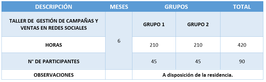 Se conformará dos grupos para el TALLER DE CAPACITACIÓN EN GESTIÓN DE CAMPAÑAS Y VENTAS EN REDES SOCIALES, cada grupo estará integrado por 45 personas quienes son amas de casa, población desempleada y subempleada en las juntas vecinales (zonas altamente vulnerables) del Departamento de Tacna y se desarrollaran 8 módulos con un total de 420 horas (210 horas por cada grupo), que estará programado en horarios de la mañana y tarde.